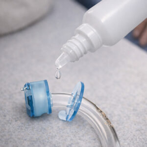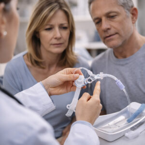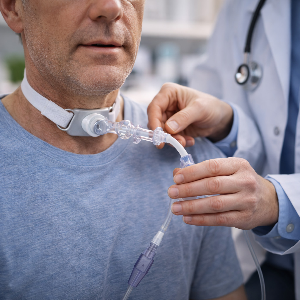 Eine Trachealkanüle wird eingesetzt, um die Atmung über eine Öffnung in der Luftröhre sicherzustellen. Das Management umfasst die ärztliche Kontrolle, Anpassung und medizinische Begleitung – sowohl bei dauerhaftem als auch vorübergehendem Bedarf.